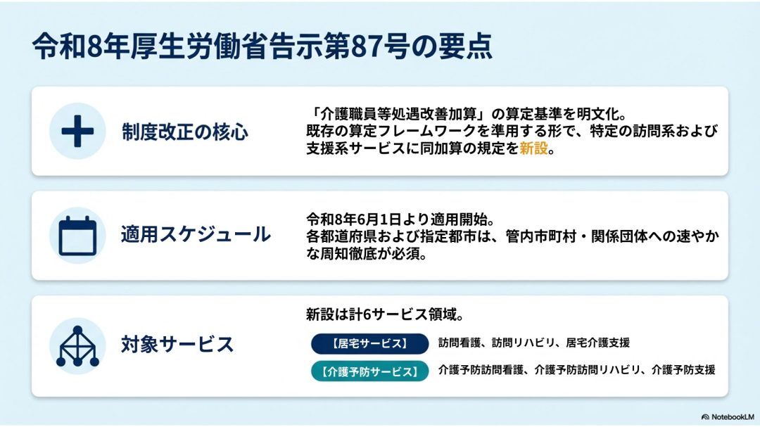 令和8年6月1日より、訪問看護や訪問リハビリテーション、居宅介護支援などのサービス算定基準に「介護職員等処遇改善加算」の取り扱いルールが新たに追加されたことを知らせています。