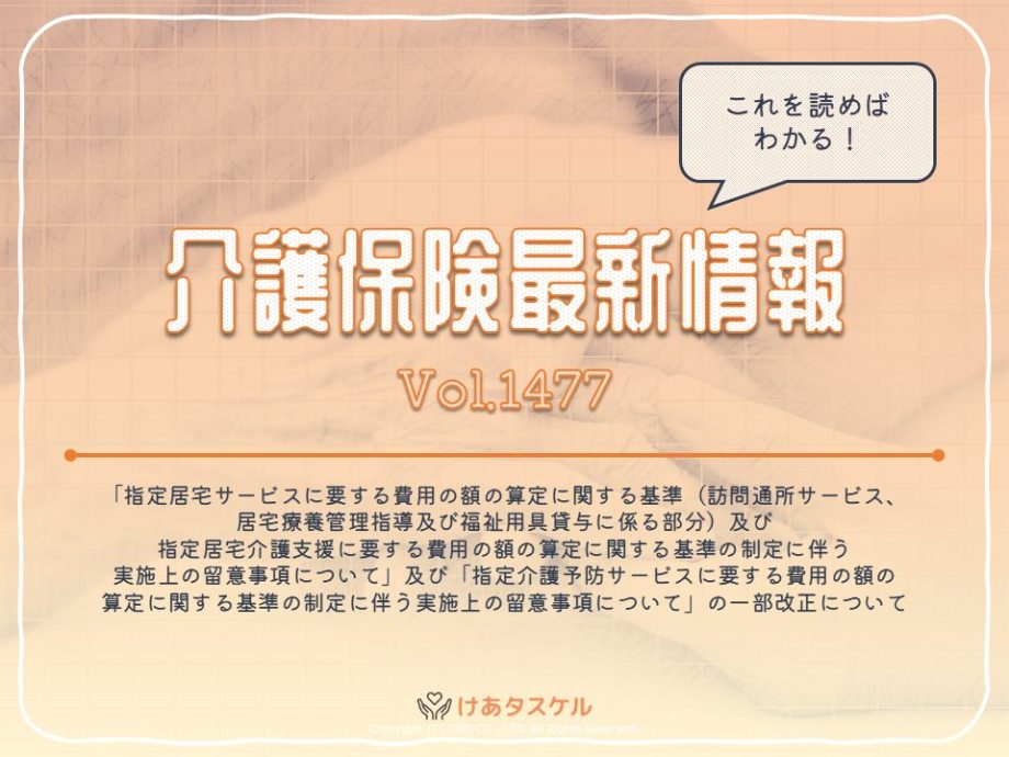 厚生労働省より介護保険最新情報Vol.1477「指定居宅サービスに要する費用の額の算定に関する基準(訪問通所サービス、居宅療養管理指導及び福祉用具貸与に係る部分)及び指定居宅介護支援に要する費用の額の算定に関する基準の制定に伴う実施上の留意事項について」及び「指定介護予防サービスに要する費用の額の算定に関する基準の制定に伴う実施上の留意事項について」の一部改正についてが令和8年3月13日に発出されました。