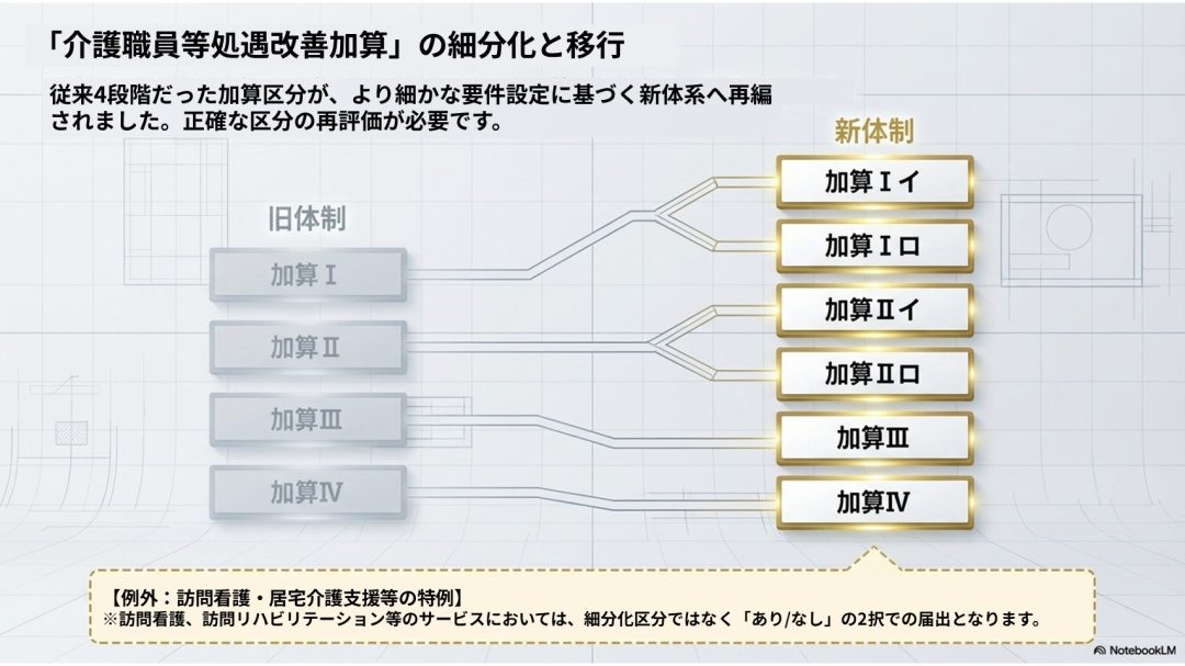 今回の改正で最も重要かつ広範にわたる変更は、「介護職員等処遇改善加算」の区分の細分化と新設です。