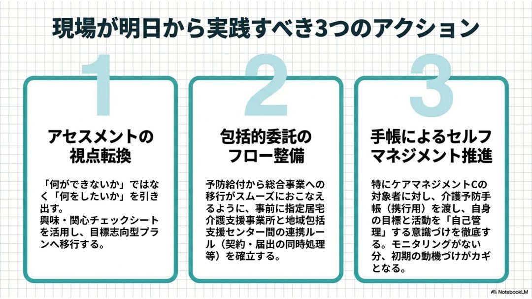 利用者の状態を把握するための「基本チェックリスト」や「興味・関心チェックシート」等の使い方のほか、利用者が自身の目標や取組を自己管理するための「介護予防手帳」の活用方針が示されています。