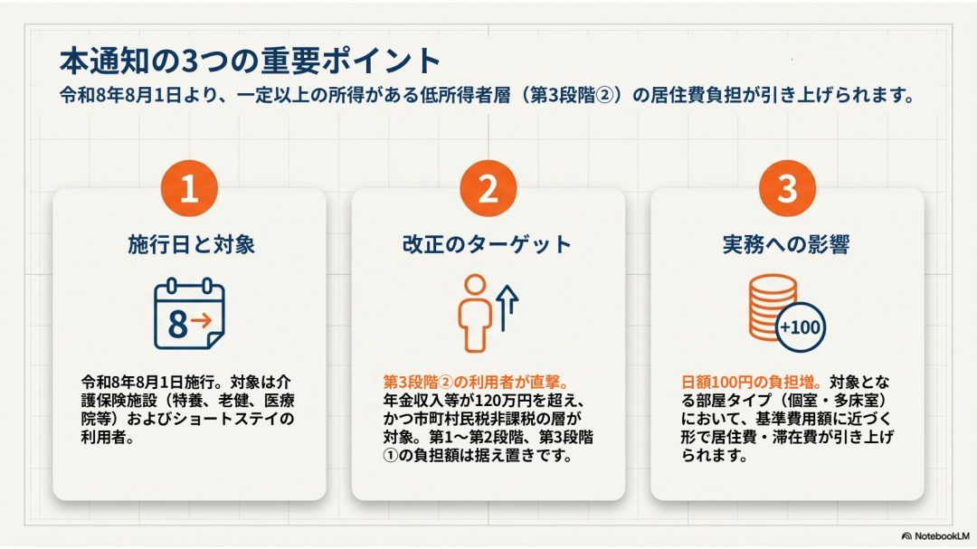 令和8年8月の制度改正により、特定の所得層(第3段階②)の利用者において居住費の自己負担額が増加します。