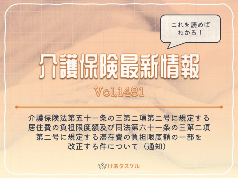 厚生労働省より介護保険最新情報Vol.1481介護保険法第五十一条の三第二項第二号に規定する居住費の負担限度額及び同法第六十一条の三第二項第二号に規定する滞在費の負担限度額の一部を改正する件について(通知)が令和8年3月13日に発出されました。